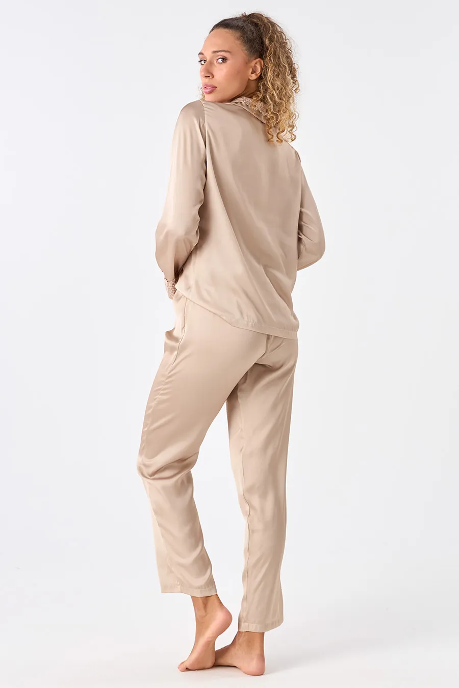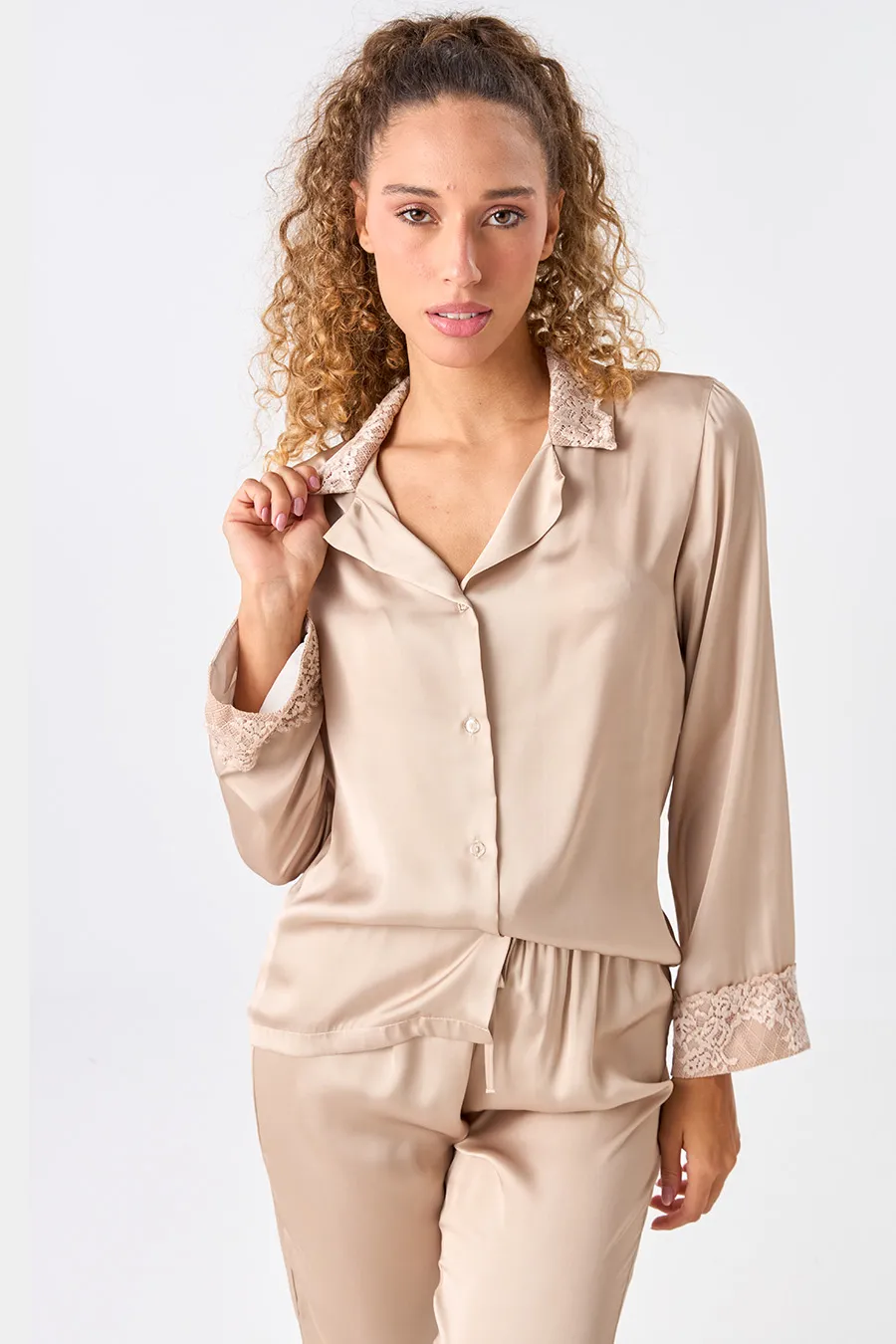 O pijama longo estilo americano é feito em um tecido acetinado Gloss com um toque sedoso, proporcionando excelente liberdade de movimento. Totalmente liso na cor maltine, a blusa de mangas longas apresenta abotoamento frontal e um decote em V, tornando-a prática para amamentação. A calça, que também possui um cós com elástico e gorgorão na mesma tonalidade, é finalizada com delicados detalhes em renda maltine. Para preservar as cores e a qualidade do tecido, recomenda-se lavar a peça separadamente. Essa é a escolha perfeita para quem valoriza conforto e elegância no dia a dia!