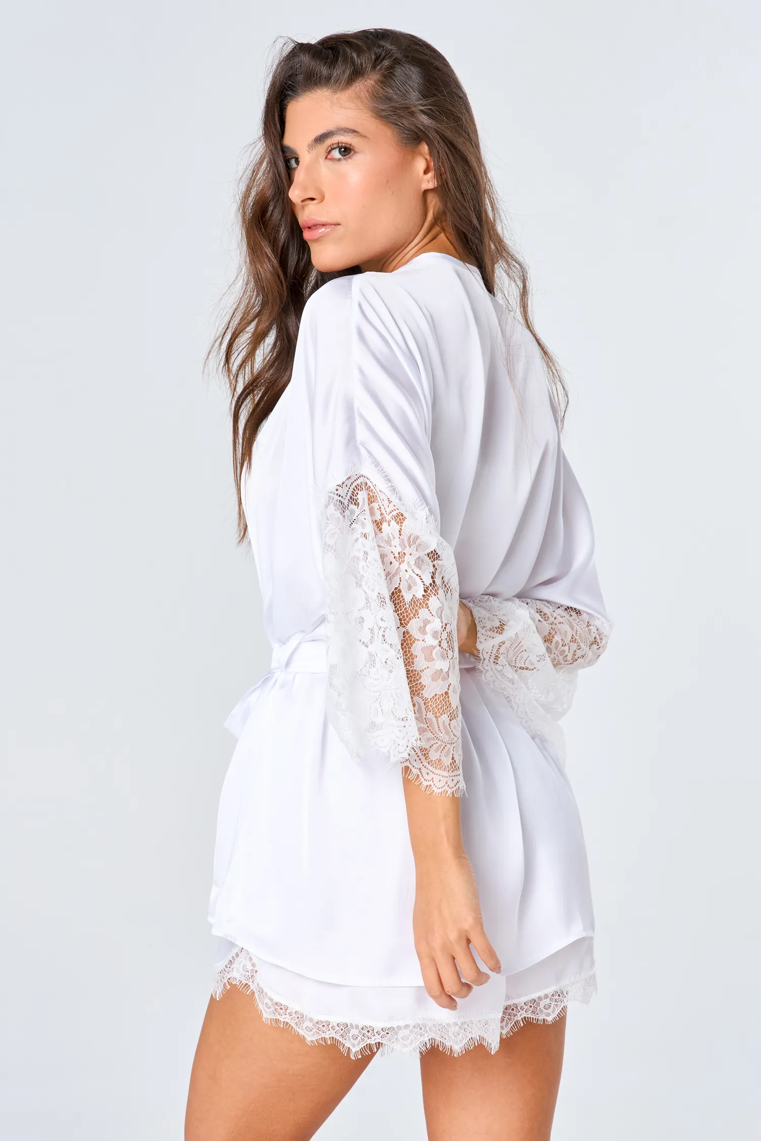 A coleção Eterno Feminino traz pijamas elegantes que nunca saem de moda, perfeitos para quem busca um estilo clássico e atemporal. Confeccionados em tecido acetinado com um toque suave, esses conjuntos são leves e extremamente confortáveis. O kimono apresenta uma amarração frontal que se adapta ao corpo, enquanto as mangas 3/4 em renda delicada adicionam um charme especial. O short possui cós elástico, garantindo um ajuste confortável. Com detalhes em renda e recortes em V nas laterais, cada peça reflete sofisticação e qualidade, tornando-se um investimento duradouro para o guarda-roupa. O top não acompanha o conjunto.